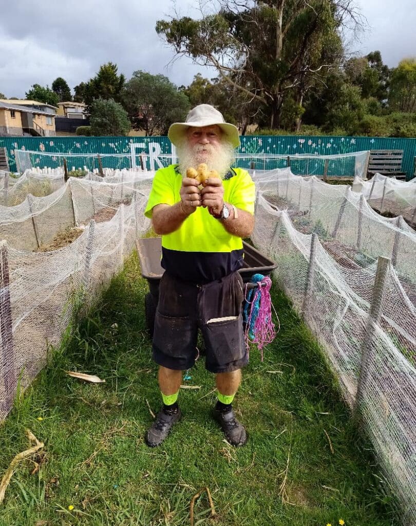 Picture: Ravenswood Neighbourhood House community leader Peter Richards brandishing an oddly shaped potato.